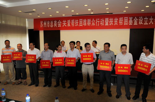 为响应中共苏州市委作出的“共产党员关爱帮扶生活困难群众行动”,日前市各民主党派、工商联发出联合倡议,号召广大成员每人每年捐款100元,连续3年,以实际行动关爱帮扶困难群众。7月6日下午,苏州市总商会设立扶贫帮困基金,11个异地商会、17家行业商会向该基金注入首笔80万元爱心款,定向用于帮扶原工商业者中的低保户和低保边缘家庭。中共苏州市委常委、统战部长周向群参加活动,市政协副主席、市总商会会长姚东明主持帮困基金设立大会。 7月2日,苏州市工商联进行宣传发动,积极动员广大会员踊跃捐款。短短几天时间,市总商会已认捐80多万元爱心款。同时,经市总商会研究,决定在市工商联会员中开展扶贫帮困活动,设立苏州市总商会扶贫帮困基金。该基金是非营利性资金,由市工商联(总商会)牵头负责,多部门参与管理,每年定期将扶贫帮困资金发放至困难群众。 辛庄商会捐款5万元。